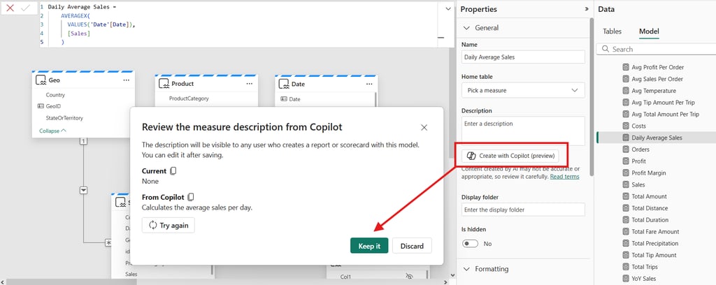 Największe zmiany dotyczą właśnie Copilota – już niedługo będzie można go wykorzystywać w raportach osadzonych w SharePoint Online, co znacznie poszerza jego dostępność. Microsoft wreszcie ogłosił również pełną dostępność funkcji automatycznego pisania opisów miar przez Copilota. Czy to koniec z pustymi polami "Opis" w naszych modelach? 😄