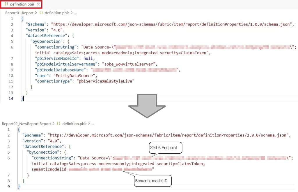 Wcześniej plik definicji (.pbir) zawierał wiele wewnętrznych, niezrozumiałych dla analityków właściwości