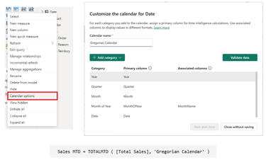 Dzięki wrześniowym zmianom, otrzymujemy wbudowany kreator zarządzania kalendarzami. Możemy tam definiować poszczególne kalendarze (np. gregoriański, fiskalny, 4-5-4) poprzez mapowanie wybranych przez nas kolumn do poszczególnych kategorii (np. rok, kwartał, miesiąc). Natomiast cały trik tkwi w tym, że do zdefiniowanego w ten sposób kalendarza możemy odwołać się w funkcjach Time Intelligence (takich jak TOTALMTD, PREVOUSVWEEK, SAMEPERIODLASTYEAR), jak do zwykłej tabeli. Powinno to uprościć modelowanie i tworzenie miar DAX pracując z kalendarzami innymi niż standardowy. Przyznacie, że to fajna zmiana?