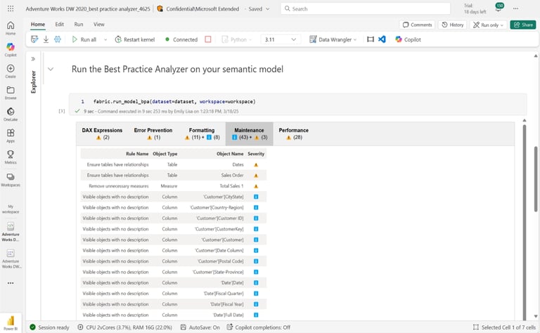 Wraz z wrześniowym update, BPA oraz MA w Fabric Notebooks wychodzą z fazy preview i stają się powszechnie dostępne. Fabricowa ocena modelu w ramach BPA składa się z 60 punktów podzielonych na pięć obszarów: