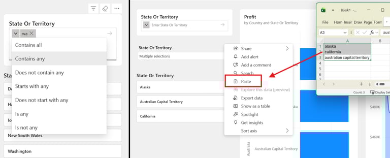 Jeśli jeszcze nie używałeś tego visuala, parę słów wyjaśnienia na temat sposobu jego działania. Przede wszystkim dzięki niemu możesz filtrować po tekstach (contains, starts with, itp.), ale też użyć slicera jako pola wejściowego do bardziej zaawansowanych scenariuszy (Translytical Task Flows). W praktyce to bardzo elastyczny sposób przeszukiwania w raportach oraz możliwość wpisywania parametrów, które nie muszą być powiązane z istniejącą kolumną, a dodatkowo listę wyborów możesz po prostu wkleić bezpośrednio do slicera np. z selekcji w Excelu.