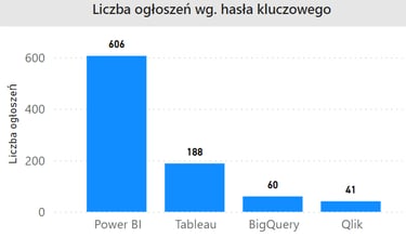 Power BI jest najczęściej wymienianym narzędziem klasy Business Intelligence w ofertach pracy. Choć oczywiście, jeśli chodzi o narzędzia, które analityk posiada w swoim stacku technologicznym, to Excel totalnie dominuje - aż 7395 ogłoszeń zawiera jego nazwę. Jednak Excel jaki ogólnie pakiet MS Office (teraz pod nazwą Microsoft 365) jest podstawą w niemal każdej pracy mającej minimalną styczność z komputerem. My skupimy się na bardziej specjalistycznych narzędziach. Jednak zanim jeszcze przejdziemy do samych ofert z programami do wizualizacji i analizy danych, to muszę nadmienić, że jest jeszcze jedno "narzędzie analityczne", które pojawia się dość często w ogłoszeniach - SQL z wynikiem 3,5 tys. ogłoszeń. To wyraźna wskazówka, czego poszukują pracodawcy.