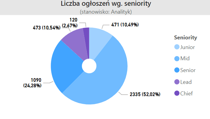 Przeglądając oferty pracy, zauważalna jest przewaga ogłoszeń skierowanych do kandydatów na stanowiska MID 0 stanowią one nieco ponad połowę wszystkich ofert dla Analityków (52%, 2335). Podczas gdy Junior to 10,5% (471), Senior 24,3% (1090), a pozostałe role jak Lead lub Dyrektor, to ok. 13% (593). Jak to interpretować? Moim zdaniem wymagania na rynku pracy rosną, a opanowanie tylko jednego programu lub technologii nie gwarantuje już sukcesu. Rynek pracy oczekuje czegoś więcej - umiejętności na wyższym poziomie, osób wszechstronnych i potrafiących samodzielnie realizować zadania. Tym samym czasy, gdy zapotrzebowanie na Juniorów było tak duże, że firmy były w stanie zatrudniać każdego i go sobie wyszkolić minęły. Jesteśmy obecnie w takim ciekawym czasie, gdzie wykwalifikowani specjaliści mogą liczyć na przyzwoite stawki, a Juniorzy walczą o pracę. Dlatego dobrze jest znać rynek pracy i wiedzieć, co jest aktualnie na topie.