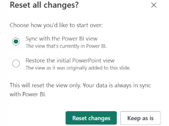 Dotychczas, gdy układ oryginalnego raportu ulegał zmianie (np. w wyniku przeładowania danych w modelu), konieczne było ponowne osadzenie raportu w PowerPoint, aby przenieść te zmiany. Teraz to już przeszłość! Program automatycznie wykryje zmiany w widoku raportu i wyświetli komunikat z pytaniem, czy chcemy zachować aktualny stan raportu, czy zsynchronizować go z najnowszą wersją dostępną w Power BI Service.