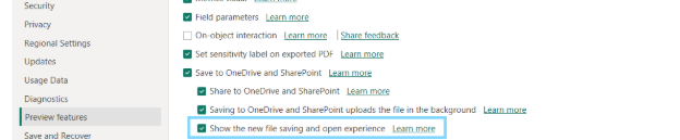 Poprawiona opcja zapisywania w One Drive jest aktualnie w wersji preview i trzeba ją sobie włączyć w ustawieniach Power BI, choć jak zapowiada Micorosft, wkrótce zmiana ta wejdzie to standardowej wersji programu. W ustawieniach możemy zmienić też adres standardowej lokalizacji w One Drive (zakładka "Save and Recovery"), trzeba jednak pamiętać, że w tym przypadku aby zmiany zaczęły obowiązywać, trzeba zamknąć i ponownie uruchomić Power BI.