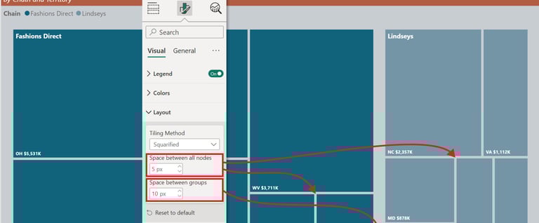 Nowe ustawienia dają możliwość większego wpływu na kształt i układ pół i grup pół w Treemap. Możesz zdecydować, czy pola mają składać się na kształt kwadratów, czy wolisz aby przybrały bardziej liniowy lub kolumnowy układ. Ponadto modyfikacji podlegać będą odległości odstępów pomiędzy polami, jak i grupami pól.