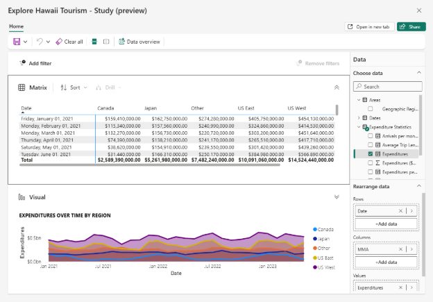 W trybie eksploracji domyślnie zaczynamy z matrixem (pivotem), z którym powiązana jest dodatkowa wizualizacja. Ich układ możemy zmieniać, z horyzontalnego, na wertykalny. Cokolwiek dodamy do matrixa, nasza wizualizacja będzie na to reagować i dostosowywać się do zmian w układzie pól. Ciekawe połączenie. Co ważne, możemy zmieniać typ wizualizacji, wybierając spośród tych standardowo dostępnych w Power BI (Microsoft deklaruje, że pracuje również nad włączeniem możliwości korzystania z customowych wizualizacji). Na przygotowane wizualizacje możemy nakładać jeszcze filtry i korzystać z funkcji drill-trough. Ostatecznie naszą eksplorację możemy zapisać i udostępnić, ale jest kilka wymagań: