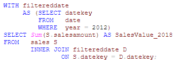 Żeby jeszcze bardziej rozłożyć to na części pierwsze, tak aby lepiej zrozumieć, co tutaj się wydarzyło, po raz kolejny odwołajmy się do SQL. Tak wyglądałaby nasza miara, gdybyśmy chcieli odwzorować logikę działania DAX w języku SQL.