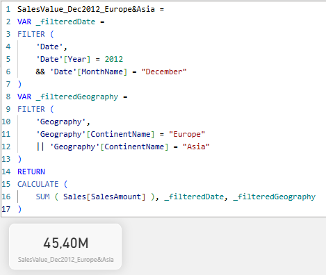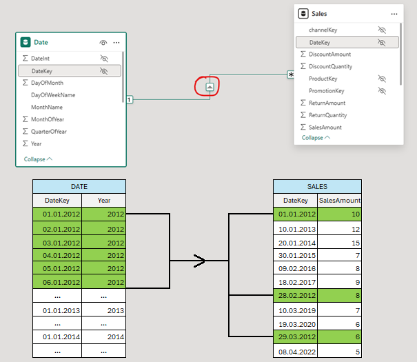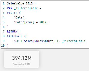 W tym momencie wykorzystujemy fakt, że tabela Date jest powiązana z tabelą Sales. Wskazujemy za pomocą CALCULATE, że agregacja, która zlicza sumę wartości sprzedaży z tabeli Sales, ma wykonać się tylko dla dat sprzedaży, które mieszczą się w 2012 roku.