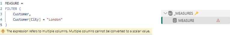 Tabela utworzona przez FILTER jest wykorzystywana w kolejnych etapach obliczeń, co przypomina tworzenie podzapytań w SQL-u, aby na wybranych danych wykonywać dalsze kalkulacje. Na potwierdzenie, że FILTER przechowuje dane, spójrz na poniższy przykład. Jeśli umieścimy samą funkcję FILTER w mierze, otrzymamy błąd. Komunikat wyraźnie mówi, że nasza kalkulacja zawiera dane tabelaryczne, podczas gdy miara oczekuje, aby jej rezultat był pojedynczą wartością (np. agregacją).