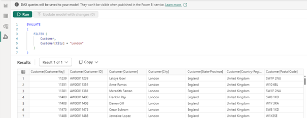 Zauważ, że mimo iż sama funkcja FILTER nie zmienia kolumn, a jedynie wiersze w zwracanej przez siebie tabeli, to poprzez odpowiednie zagnieżdżenie funkcji ALL możemy zmienić także te elementy. Podobnie, jeśli chodzi o dodawanie nowych kolumn, które w oryginalnej tabeli Customer nie istnieją, możemy to zrobić za pomocą funkcji ADDCOLUMNS.