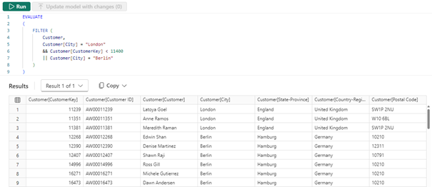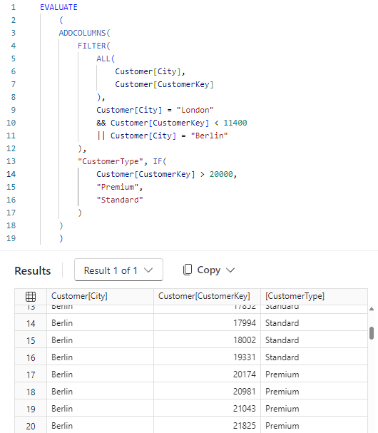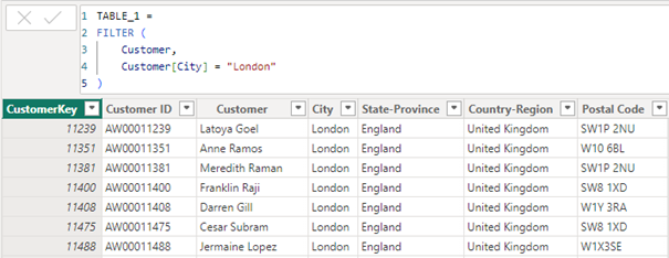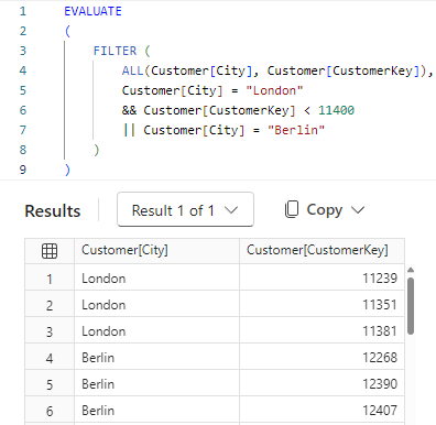 Tłumacząc działanie kodu: Za pomocą funkcji ALL (która również jest funkcją tablicową) tworzymy nową dwukolumnową tabelę Customer. Następnie używamy jej jako obiektu w funkcji FILTER, którą następnie filtrujemy. Dzięki temu otrzymujemy nową tabelę składającą się z kolumn City i CustomerKey, zawierającą tylko wiersze, które spełniły warunki filtrowania.