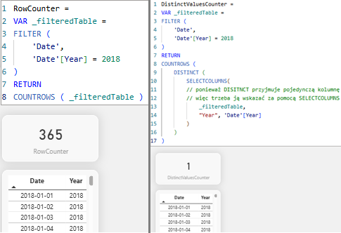 Poniżej znajdziesz prosty przykład dwóch miar, gdzie jedna z nich ma za zadanie zliczać wiersze w przefiltrowanej tabeli filteredTable, a druga liczy tylko unikatowe wiersze z tabeli filteredTable w kolumnie Calendar[Year]. Pamiętaj, że używając _filteredTable nadal odwołujemy się do tabeli Calendar i jej kolumn, ponieważ to jest nasze źródło danych oryginalne źródło danych. Dla lepszego uporządkowania kodu korzystam z warunków (VAR), rozdzielając kod na mniejsze, bardziej czytelne części.